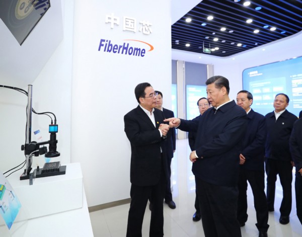 26日上午,习近平先后来到位于东湖高新区的烽火科技集团和武汉新芯集成电路制造有限公司,考察企业创新发展情况。东湖高新区是首批国家级高新区,2016年获批中国(湖北)自由贸易试验区武汉片区。这里是全球最大的光通信研发生产基地,被誉为“中国光谷”。在烽火科技集团,习近平听取武汉市新旧动能转换发展情况汇报,察看企业自主创新成果展示,了解企业优化调整产业结构和加强党建工作等情况。展厅里陈列着烽火科技集团以及长飞光纤光缆股份有限公司等研制的芯片、光纤等高科技产品。习近平一边察看实物一边了解产品用途、性能、国产化率、在国际同行业中的地位等情况。听到介绍烽火科技在“超大容量、超长距离、超高速率”光通信领域的研发和生产处于世界领先地位,一根光纤上可实现67.5亿对人同时通话,总书记点头表示赞许。他语重心长对企业负责人说,新发展理念,创新是第一位的。我国已经成为世界第二大经济体,过去那种主要依靠资源要素投入推动经济增长的方式行不通了,必须依靠创新。具有自主知识产权的核心技术,是企业的“命门”所在。企业必须在核心技术上不断实现突破,掌握更多具有自主知识产权的关键技术,掌控产业发展主导权。国家需要你们在这方面加快步伐。他要求企业加强党建工作,以党建引领促进企业创新发展。