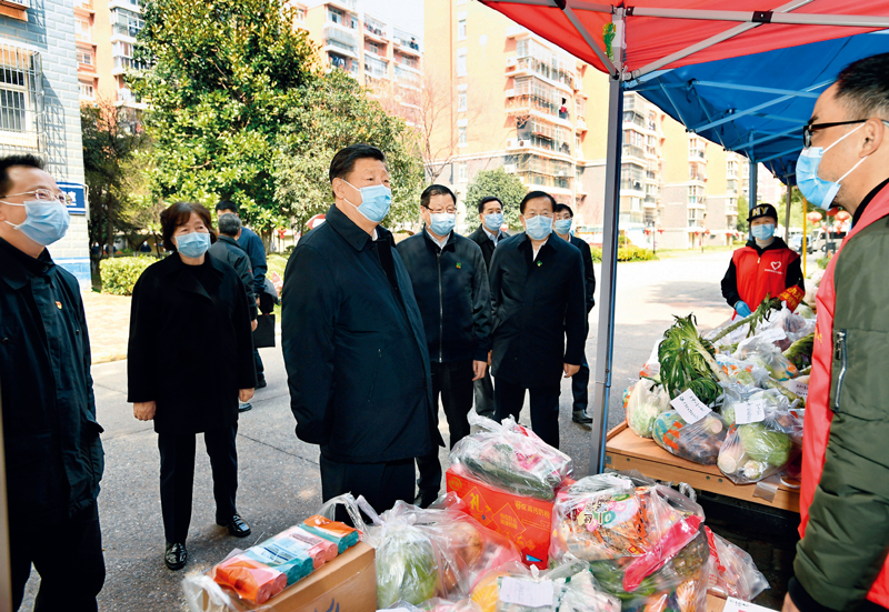 2020年3月10日,中共中央总书记、国家主席、中央军委主席习近平专门赴湖北省武汉市考察新冠肺炎疫情防控工作。这是习近平在东湖新城社区生活物资集中配送点,详细询问社区群众生活物资采购和供应情况。