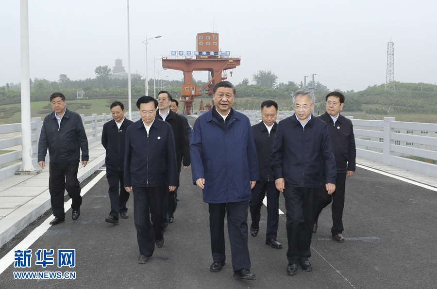 习近平首先来到陶岔渠首枢纽工程,实地察看引水闸运行情况,随后乘船考察丹江口水库,听取有关情况汇报,并察看现场取水水样。习近平强调,南水北调工程是重大战略性基础设施,功在当代,利在千秋。要从守护生命线的政治高度,切实维护南水北调工程安全、供水安全、水质安全。吃水不忘挖井人,要继续加大对库区的支持帮扶。要建立水资源刚性约束制度,严格用水总量控制,统筹生产、生活、生态用水,大力推进农业、工业、城镇等领域节水。要把水源区的生态环境保护工作作为重中之重,划出硬杠杠,坚定不移做好各项工作,守好这一库碧水。