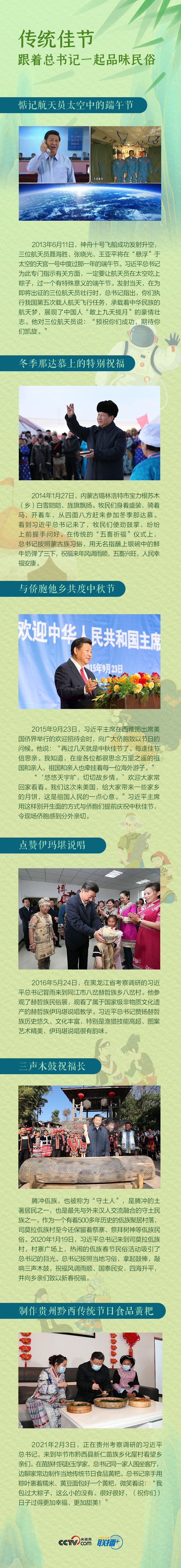 端午节吃粽子的习俗曾受到总书记的“特别关注”。2013年的端午节,恰逢神舟十号飞船在轨运行。飞船发射之前,习近平总书记曾专门指示有关方面,一定要让航天员在太空吃上粽子,过一个有特殊意义的端午节。