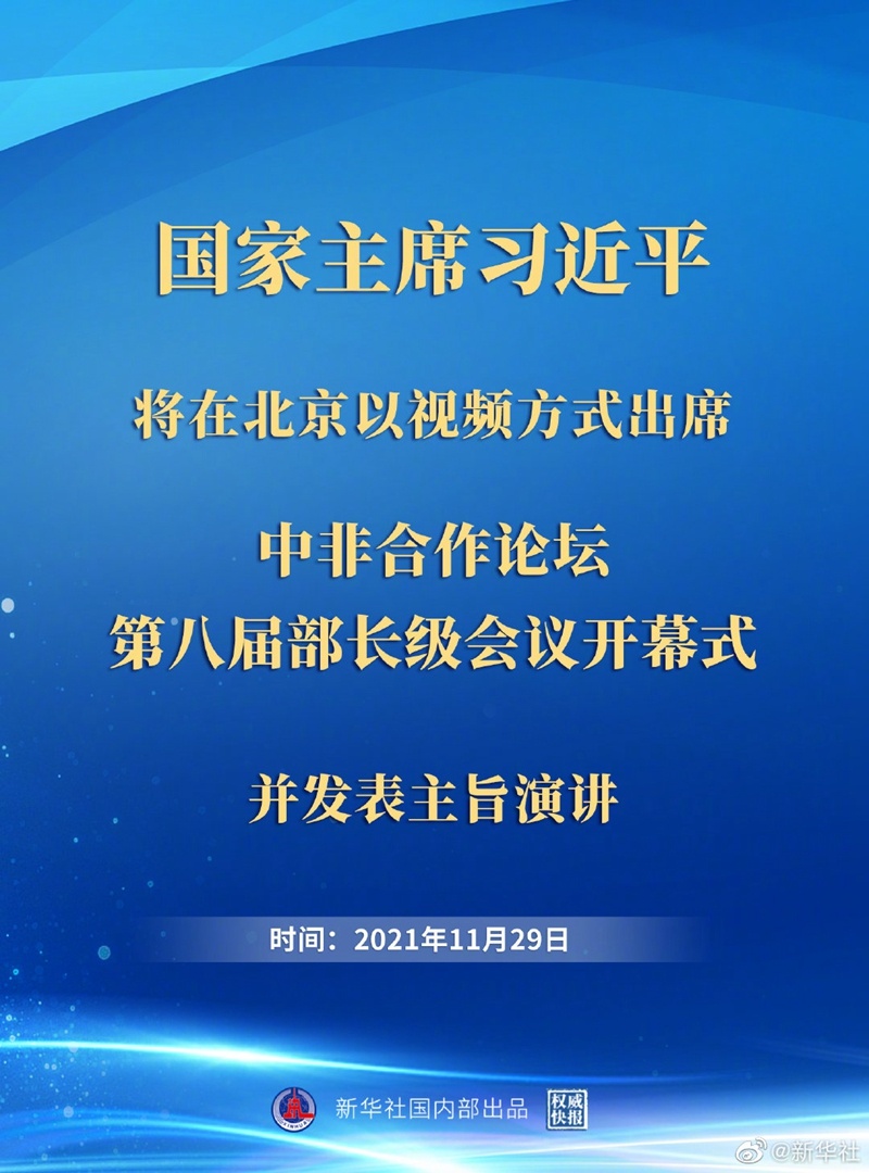 习近平将出席中非合作论坛第八届部长级会议开幕式 来源:新华社微博 发布时间:2021-11-26 19:27:00 浏览次数: 次 【字体:小 大】 外交部发言人华春莹11月26日宣布:国家主席习近平将于11月29日在北京以视频方式出席中非合作论坛第八届部长级会议开幕式并发表主旨演讲。 分享到: 【打印正文】
