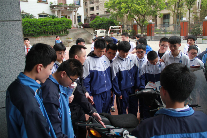 芙蓉大队还制作了宣传展板,带来了依法收缴违法改装和拼装摩托车进行展出。另外,他们邀请了特巡警支队队员,在校园内为同学们进行面对面的宣讲交通知识,告诫同学们一定要遵守交通规则,关爱生命。